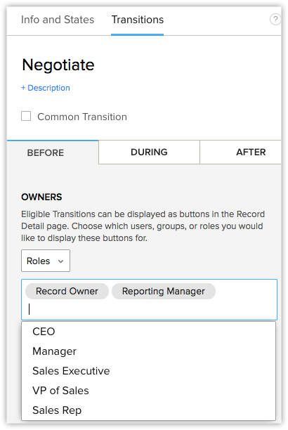 Zoho CRM中的蓝图创建您业务流程的在线副本,以帮助您跟踪业务中涉及到的不同阶段。按照蓝图中的定义,业务涉及的每个阶段被称为“状态”,两个状态之间的连接称为迁移。针对记录创建的迁移将显示在记录的明细页面。要完成迁移,必须执行迁移中指定的操作。通过使用报告层级,您可以选择记录所有者的上报经理以执行操作,并完成迁移过程。