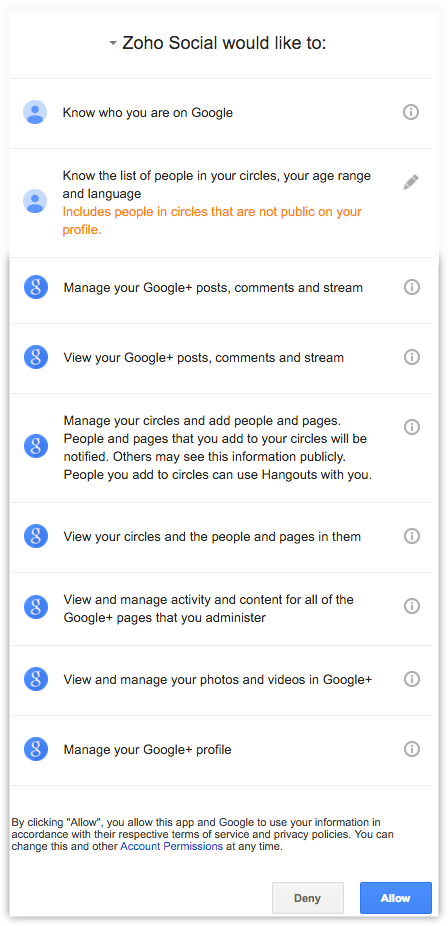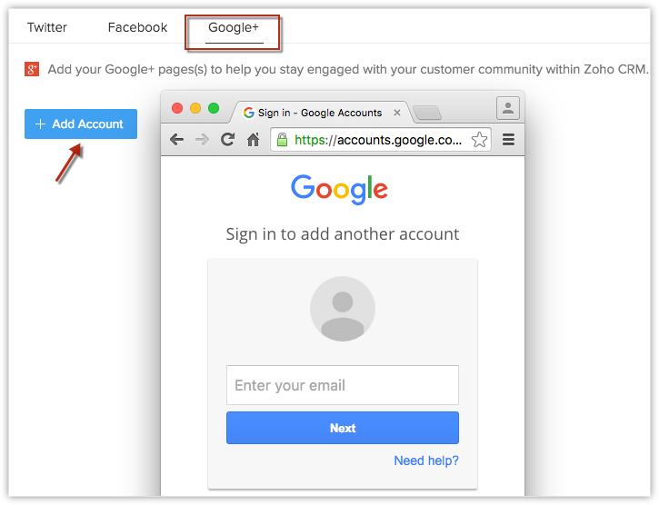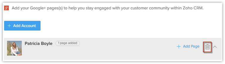 - 对于 Zoho CRM 中要配置的 Google+ 帐户,它需要有一个页面与其关联。即使您尝试在未将页面与其关联的情况下配置 Google+ 帐户,一旦您离开社交设置,该帐户也将自动删除。