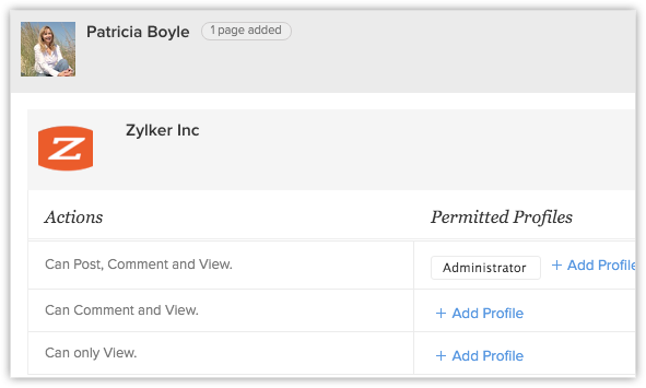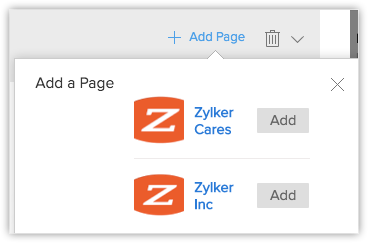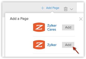 您的 Google+ 帐户现在已与 Zoho CRM 关联。 - 点击添加页面。
