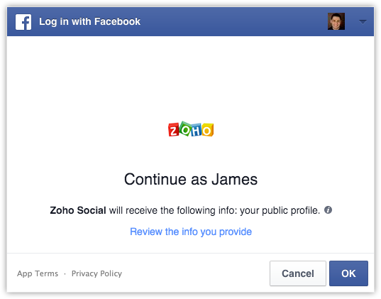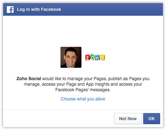 为了添加 Facebook 页面,您必须对 Facebook 帐户授权,并对 Zoho Social 进行授权以访问 Facebook 帐户中的信息。您可以根据您的需求查看并选择一组要执行的操作。它们将显示在下面的屏幕截图中。