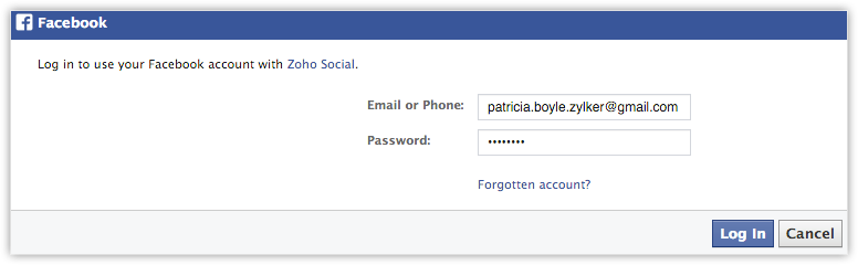 请确保弹出窗口拦截器在浏览器中已禁用。 - 在 Facebook 弹出窗口中,指定您想关联到 Zoho CRM 的公司 Facebook 帐户的登录凭证。
