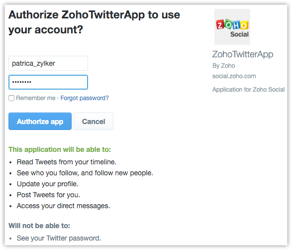 请确保弹出窗口拦截器在浏览器中已禁用。 - 在 Twitter 弹出窗口中,指定您想关联到 Zoho CRM 的公司 Twitter 帐户的登录凭证。