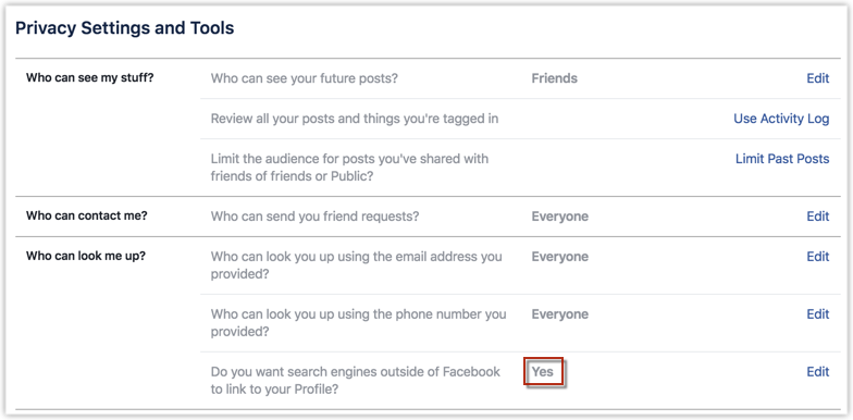 - 对于 Facebook,在“隐私设置和工具”部分下启用了“您是否想要 Facebook 以外的搜索引擎链接到您的角色”的所有匹配用户将列示在结果中。