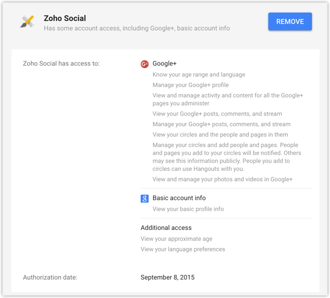 将列出您授权与 Google+ 帐户互动的应用程序。 - 选择 Zoho Social 应用,并点击移除链接。