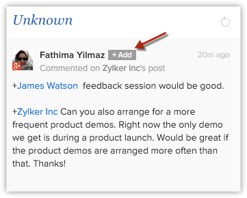 最初,社交互动在“未知”栏中列出。您可以将“未知”栏中的人添加为新线索/联系人或将它们关联到现有线索/联系人。完成之后,帖子将显示在适合的 CRM 类别中。