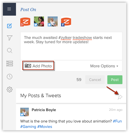 - 在 Facebook、Twitter 和 Google+ 撰写和发布帖子。您也可以在帖子中附加图像。