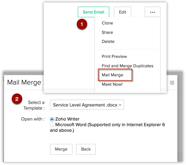 创建邮件合并模板并将其保存在 Zoho CRM 中后,可以将文档与 CRM 记录合并,并随时通过电子邮件将它们发送给所需客户。
