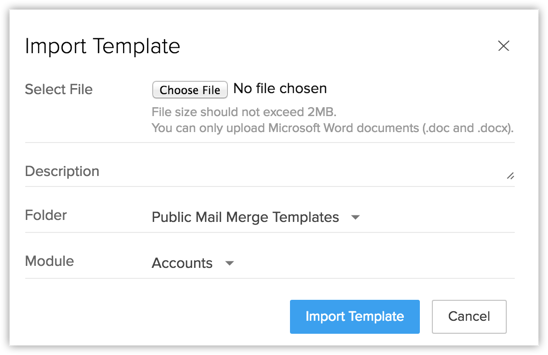 也可以在 Microsoft Word 中创建邮件合并模板,并且可在 Zoho CRM 中导入这些模板。要使用此功能,您需要购买用于 Microsoft Office 的 Zoho CRM 插件。请注意,对于合并数据,此功能仅在 Internet Explorer 6 及更高版本中受支持。 另请参阅 Zoho CRM 的 MS Office 插件