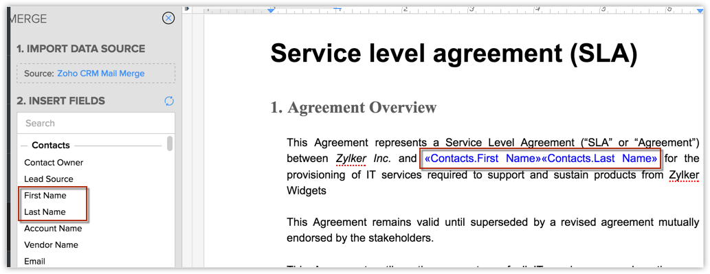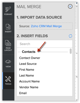 文档将在 Zoho Writer 中打开。 - 从插入字段部分中选择合并字段。