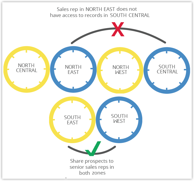另一方面,区域更容易管理。 例如: 您的销售结构基于地区划分。 负责来自中国的客户要求的销售执行人员是您的团队中的星级表现者。 您决定赋予该销售代表额外的职责,即处理来自日本的客户。 在这样的示例中,区域管理让您可以在中国和日本销售区域灵活添加用户,在这些区域中销售执行人员可以访问来自这两个国家的客户记录。