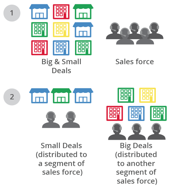 假设您的客户账户划分从小型企业到大型公司不等,机会由销售人员基于交易规模进行处理。 在这样的机构中,使用区域划分您的销售团队并按企业规模分配潜在客户从而获得数据可视性以及共享的灵活性。