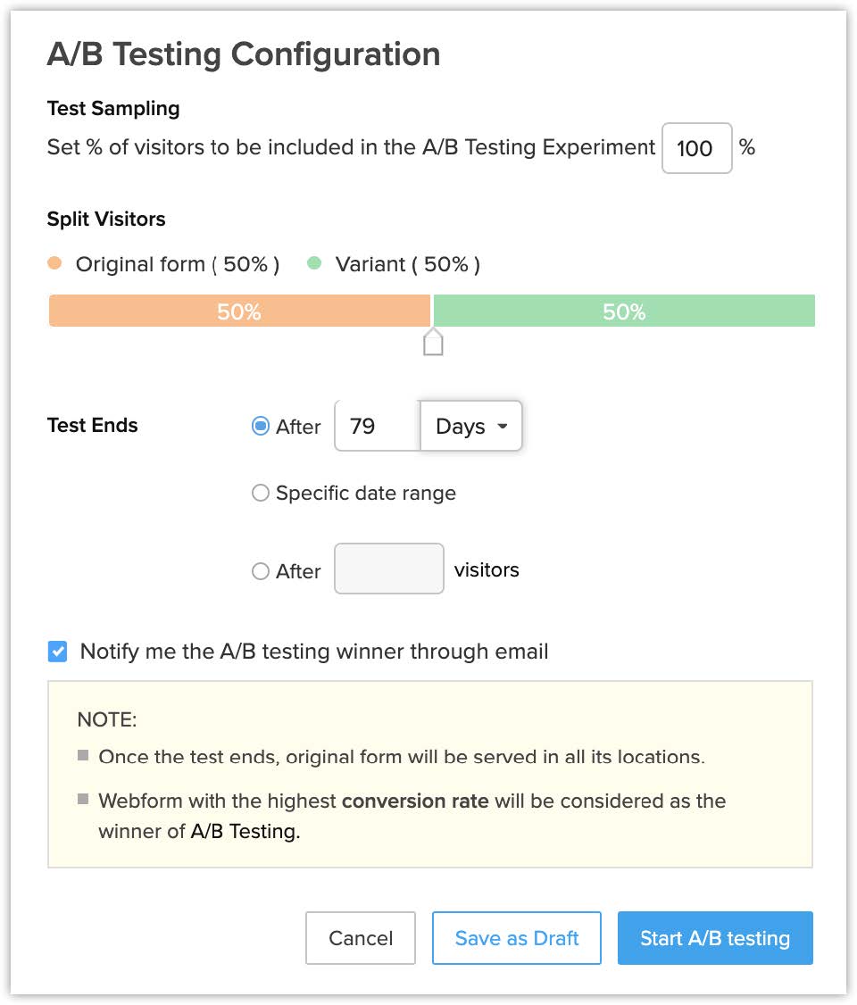 设置A/B测试应定义参加A/B测试的访客的百分比。此外,还应指定查看原始Web表单及其变体的访客百分比。 可以设定A/B测试结束日期或访客数量。您也可以将“ A/B测试 ”配置另存为草稿。