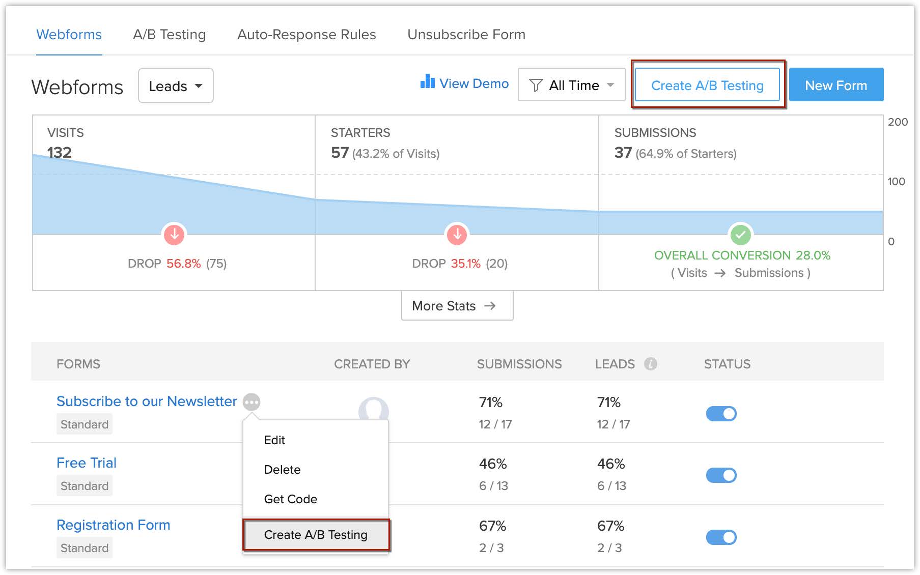 或者,您可以通过单击Web表单页面上的 创建A/B测试 按钮或将鼠标指针移至 Web表单选项卡下的所需Web表单上,然后单击 更多 > 创建A/B测试,来创建A/B测试。