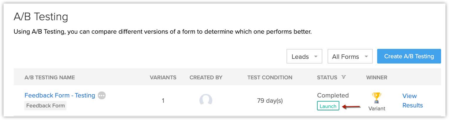 - A/B测试完成后,只有原始表单可供所有访客使用,直到启动获胜者。