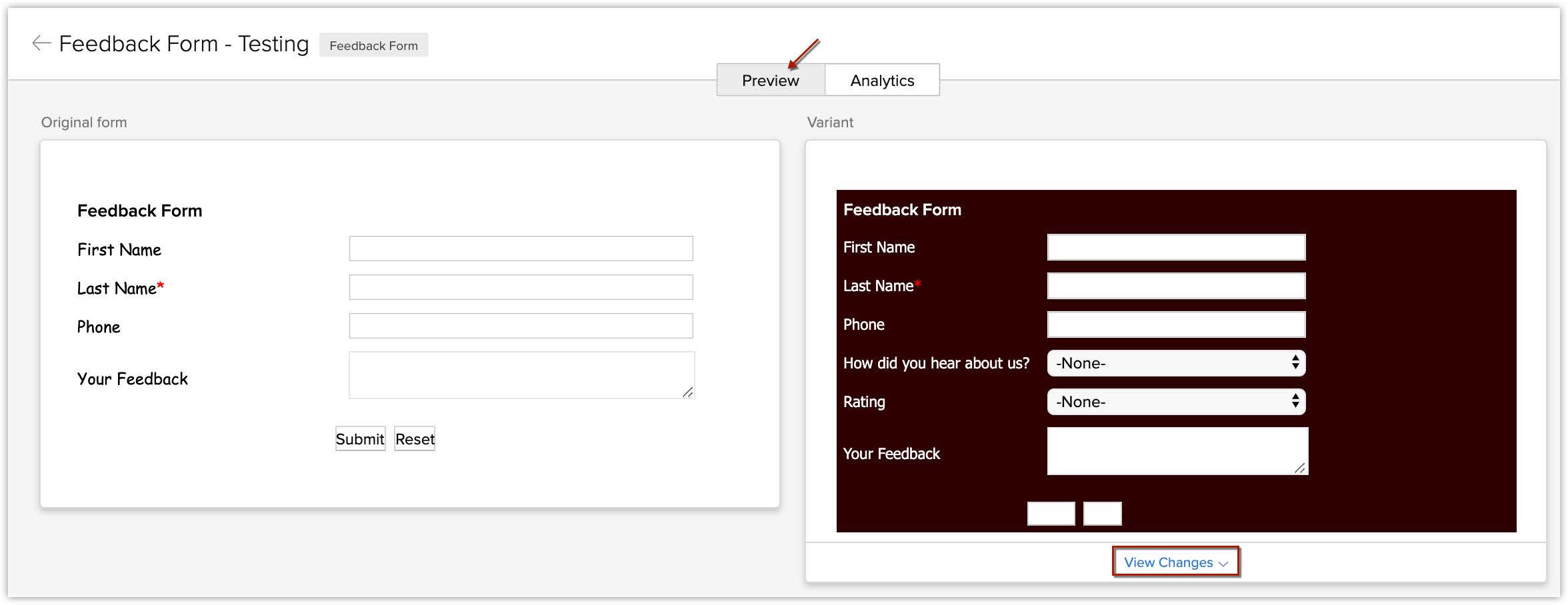 您可以通过包括更多字段、修改字段属性、更改“文字-动作”按钮、更改字体、修改表单的背景色等来创建原始Web表单的不同版本。您在变体中所做的所有更改都可以从更改列表中查看。如果需要,您还可以还原更改。