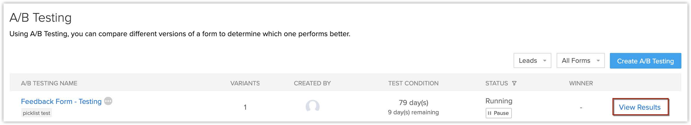 A/B测试开始后,您可以查看状态和有关原始表单和变体性能的统计信息。 - 启动获胜者