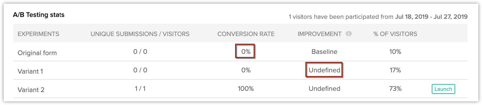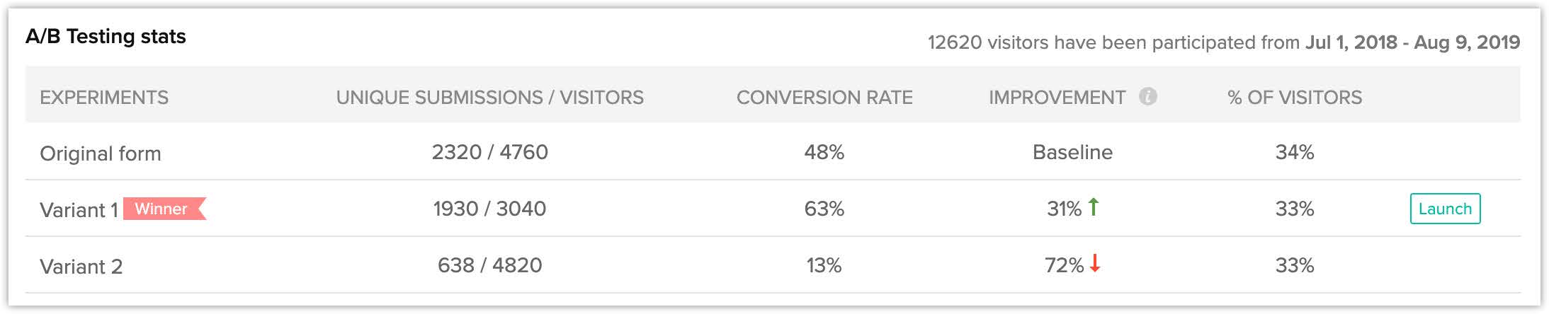 在您运行了一段时间的测试后,将根据转化率(即提交表单的访客百分比)来宣布获胜者。您可以启动获胜者,这意味着表现良好的表单将替换原始表单。