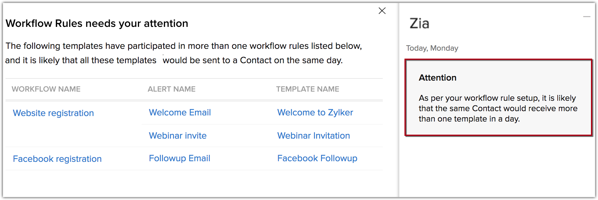 Zia 为您的自动化流程引入了 AI,针对工作流规则提供智能异常和建议信息。她会密切监视工作流规则以便让您了解工作流的效果及您可采取的改善措施。Zia 还可找出错误并阻止您做出错误行为,例如,同一天将两个电子邮件模板发送给同一客户。