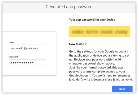 为您的账户生成唯一的应用程序特定密码。 注意,此密码仅显示一次,不再显示。