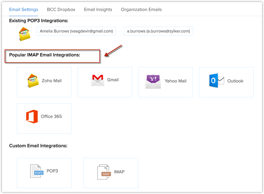 IMAP 是邮件协议,您的邮件账户通过此协议在 Zoho CRM 中进行配置。 它提供各种益处,其中最佳的就是它启用了多台装置同步。 这就是说您的邮件活动在您的计算机、笔记本电脑、手机、平板电脑等之间实现同步。Zoho CRM客户管理系统让您可以在常用邮箱服务的 IMAP 集成之间选择或配置自定义邮件集成。