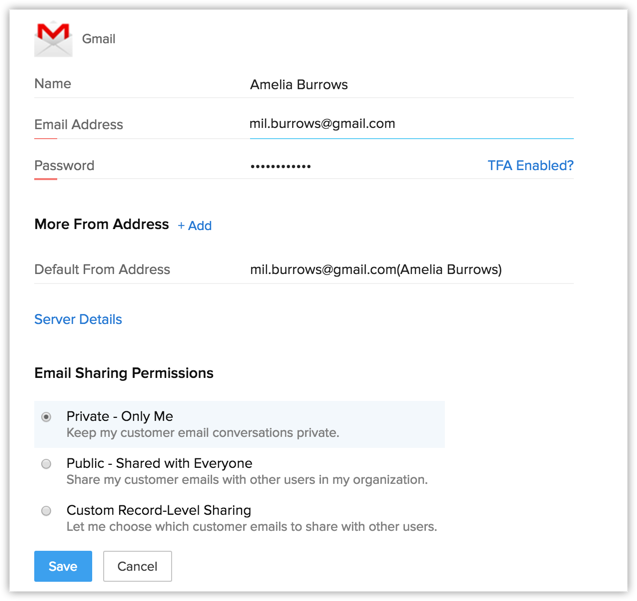 服务器详细信息在选择一个常用邮箱服务的 IMAP 集成时自动填充。 - 选择邮件共享设置。