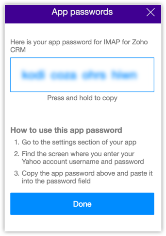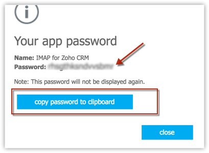 - 立即复制并粘贴此密码到 Zoho CRM 中 IMAP 配置的密码文本框中。