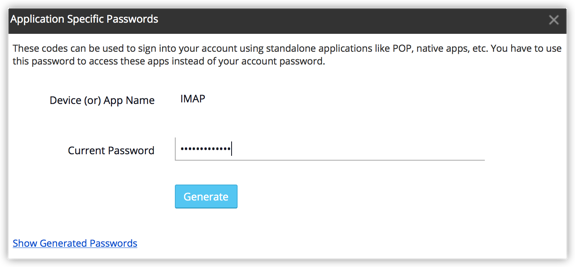 如果您希望在 Zoho CRM 中配置的邮件账户启用了双因素认证服务,则您必须为 IMAP 配置输入邮件账户的应用程序特定密码而非您的常规邮件账户密码。 以下是为各种常用邮箱服务的邮件客户端生成应用程序特定密码的说明。