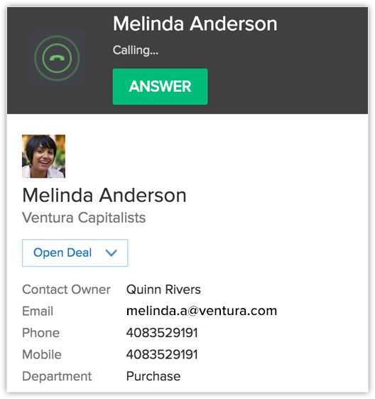 - 您通过 Amazon Connect 接听来自 CRM 联系人的电话或者给 CRM 联系人拨打电话时,您可以在 Zoho CRM 中看到您的联系人的名片视图。