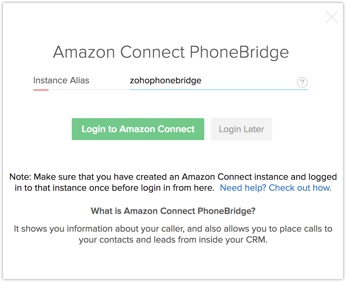 一旦您启用了 Amazon Connect 集成,您将得到提示,从 Zoho CRM 登录您的 AWS 账户。