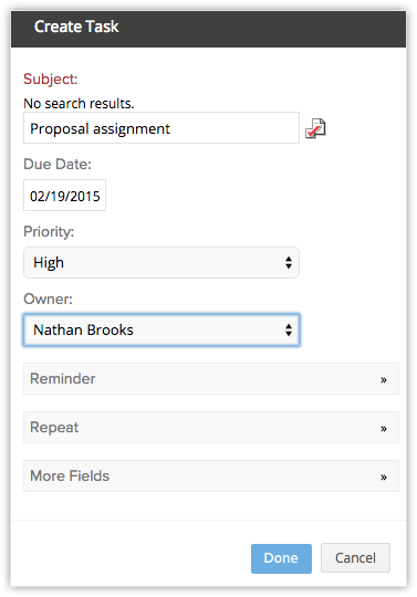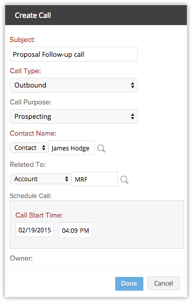 每次通过 RingCentral 的电话结束时,您可以从 Zoho CRM 中通话结束窗口进行下列任意或所有活动。 这些将自动关联至相关记录。