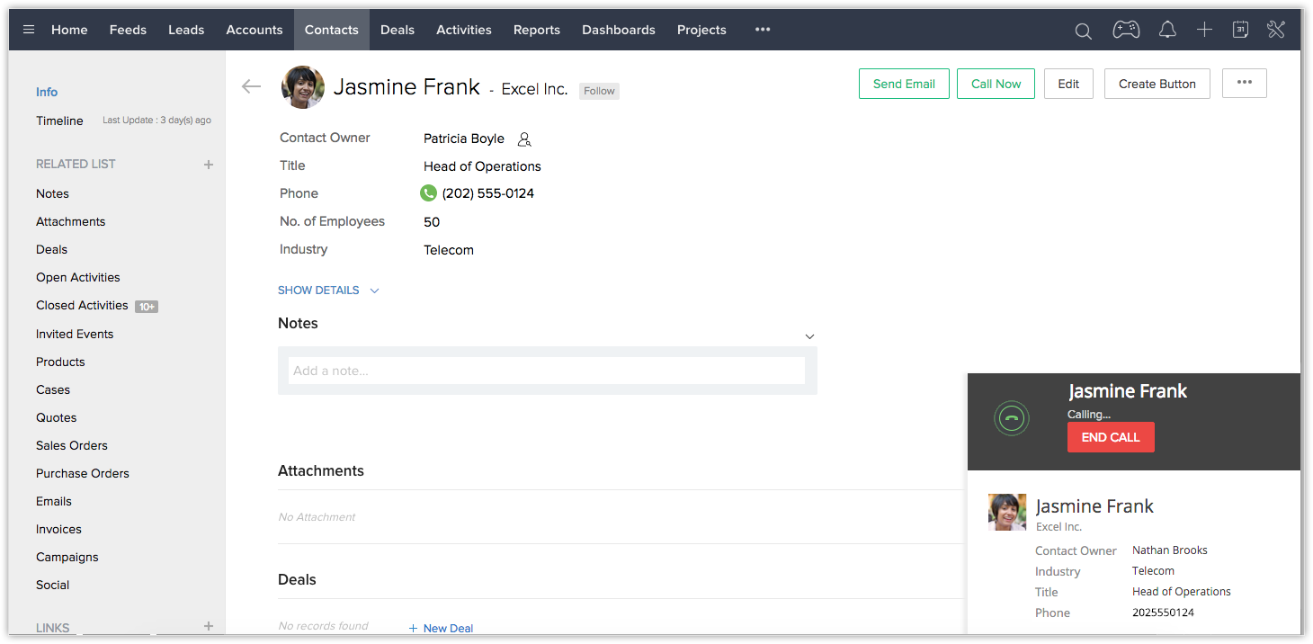 - 您通过 RingCentral 接听来自 CRM 联系人的电话或者给 CRM 联系人拨打电话时,您可以在 Zoho CRM 中看到您的联系人的名片视图。
