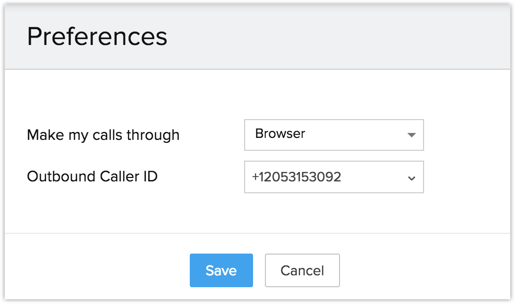 您需要从通话偏好弹出页面中选择浏览器选项从而通过您的浏览器进行通话。 您也可以将您的偏好与收件人的拨出通话者 ID 一起保存,这样您可以在拨出电话时轻松将您的通话者与您的 RingCentral 号码联系起来。
