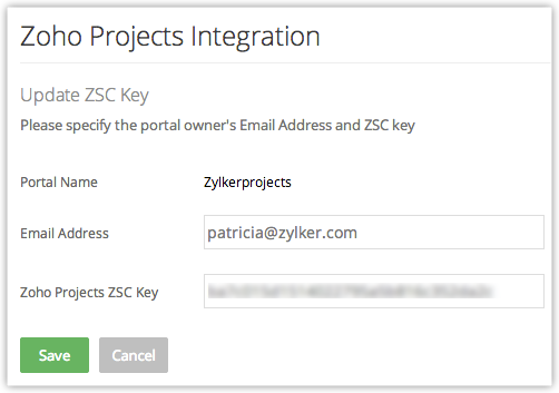 - 在 Zoho Projects 集成页面中,输入新的 ZSC 密钥和关联的电子邮件地址。