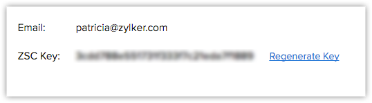 显示 ZSC 密钥和关联的电子邮件地址。 - 如有需要,在 Zoho Projects 与 Zoho CRM 集成时复制并粘贴这些项。