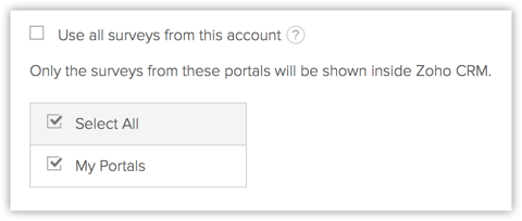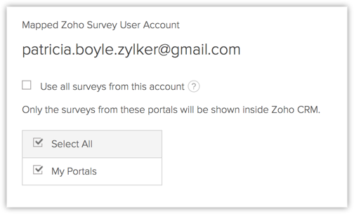 - 如果您已经有了 Zoho Survey账户,Zoho CRM 将自动映射您的账户下所有门户。 选择您希望在 Zoho CRM 中使用的门户,点击提交。