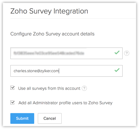 注意,只有来自相关 Zoho Survey账户的 CRM 用户在此部分中显示。 尚未使用 Zoho Survey的 CRM 用户将被推送至 Zoho Survey账户。 - 点击提交。