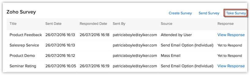 您发送宣传后,您可以在对应的线索/联系人详细信息页面(Zoho CRM 中 Zoho Survey部分下方)中查看这些调查的回复。