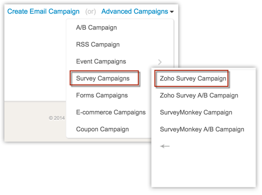 - 如需创建调查宣传,在邮件宣传选项卡下方,点击高级宣传 > 调查宣传 > Zoho Survey宣传。