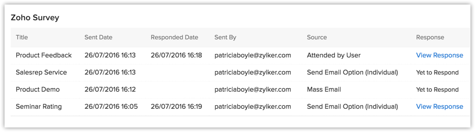 在Zoho Survey部分下方,发送给记录的邮件调查详细信息将列出。 发件人和来源列告诉您宣传是通过单发/群发邮件/工作流提醒从 Zoho CRM 发送或从 Zoho Campaigns发送。