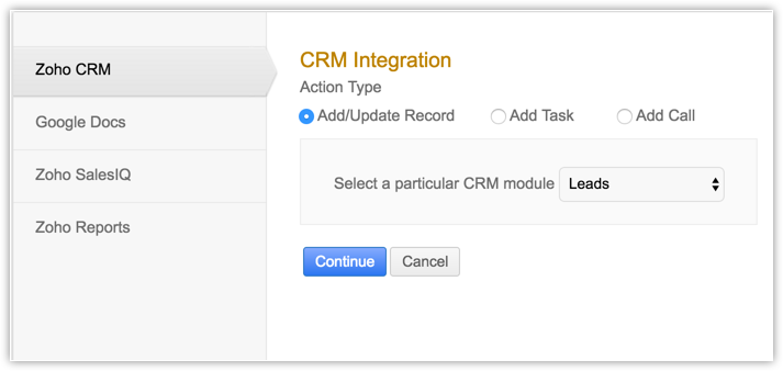 如果您没有合适的字段,在 Zoho CRM 中创建自定义字段并将字段映射到问题。 - 选择操作类型为更新记录。 这意味着 Zoho CRM 仅会更新现有记录的字段。