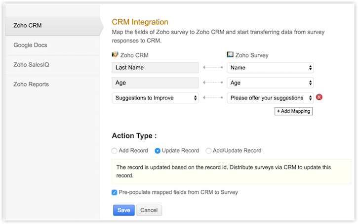 如果您希望 Zoho CRM 检查重复,选择 添加/更新记录。 如果存在重复,仅现有记录将被更新。 如果没有这样的记录,则将创建新记录,回复将被添加。 - 如果您希望 Zoho Survey显示 Zoho CRM 中已经可用的字段的现有值,选择事先填充从 CRM 映射到调查的字段。