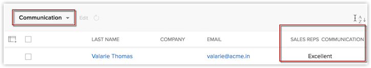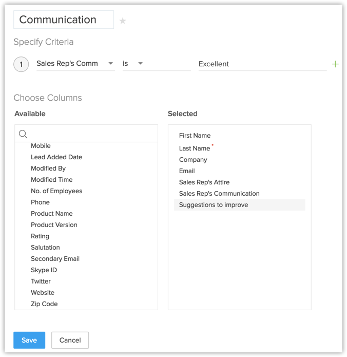 如您所见,调查回复现在可作为 CRM 数据使用。 您可以基于某些标准过滤特定记录。 例如,如需查看谁将销售代表的沟通技巧评价为“出色”,使用合适的标准创建自定义视图。