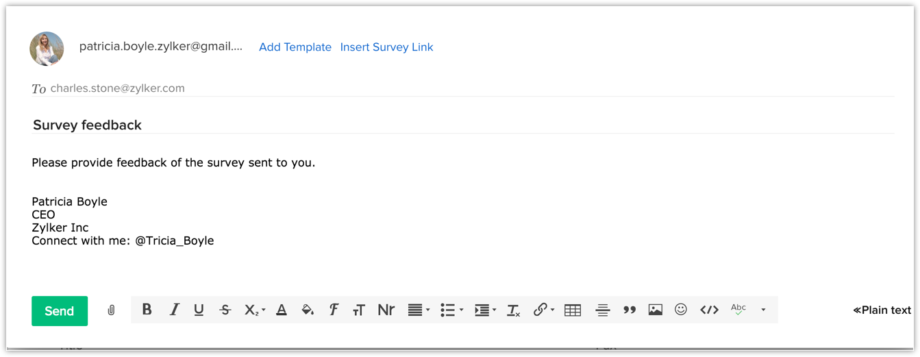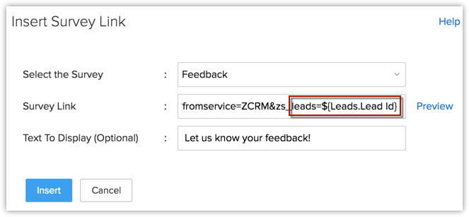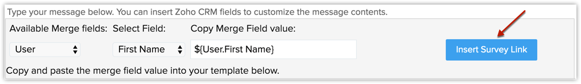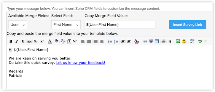 当您在 Zoho Survey中创建了您的调查后,您可以从 Zoho CRM 通过邮件将它发送给您的所有联系人。 您必须创建有所需调查链接的邮件模板。 此模板之后可插入您给联系人的邮件中。