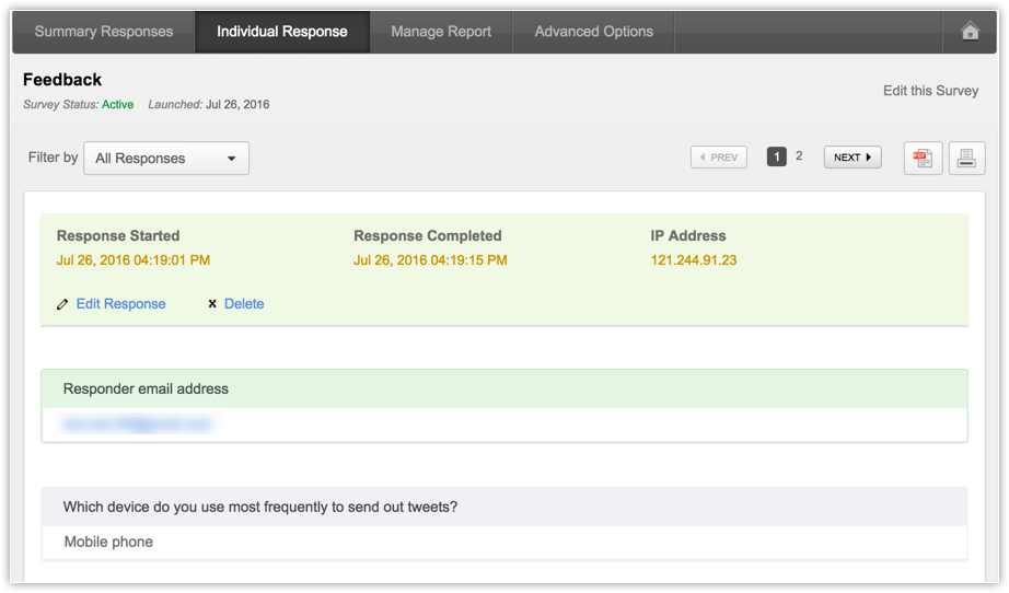 例如,您向您的客户发送了关于您的销售代表表现的调查。 调查中有一个问题要求收件人评价销售代表的沟通技巧。 您希望查看技巧评价为“出色”的所有用户。 您只需应用过滤器,搜索自定义字段“销售代表的沟通”的值为“出色”的所有记录。 这样就可以了! 满足标准的所有记录都会显示。