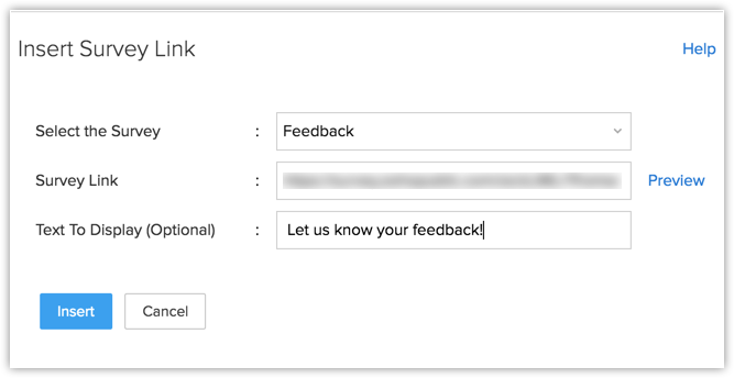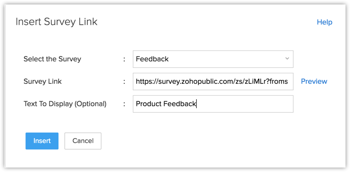- 在插入调查链接弹出页面中,从选择调查下拉列表中选择您希望插入的调查。