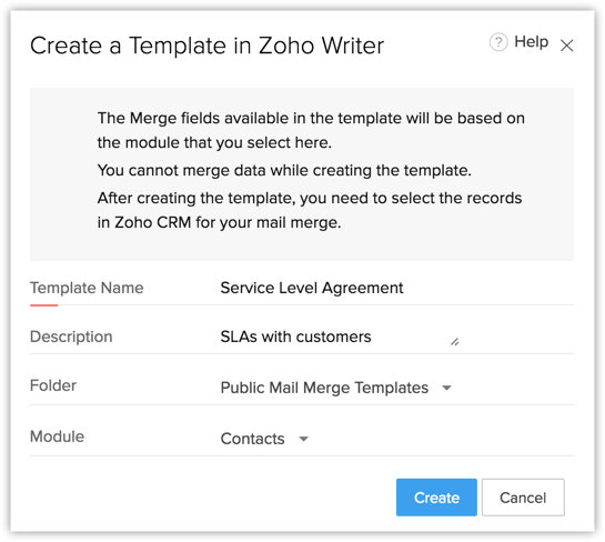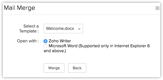 - 利用 Zoho Writer 插件,您只能使用来自线索、客户、联系人和商机模块的数据创建邮件合并文件。