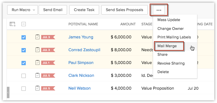 - 通过邮件发送邮件合并文件给线索、客户、联系人、商机、记录所有者或用户。