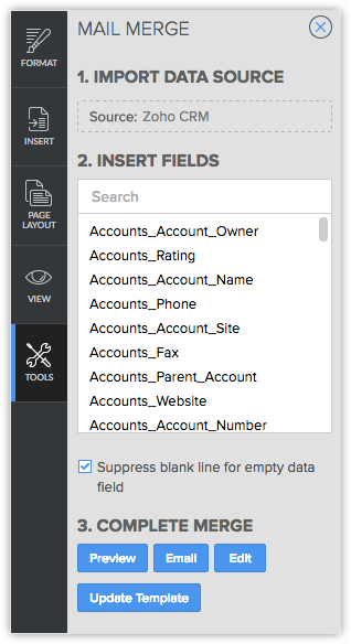 在 Zoho Writer 中打开模板后,您需要合并来自CRM软件的数据。 合并后,您可以打印合并文件或通过邮件发送。