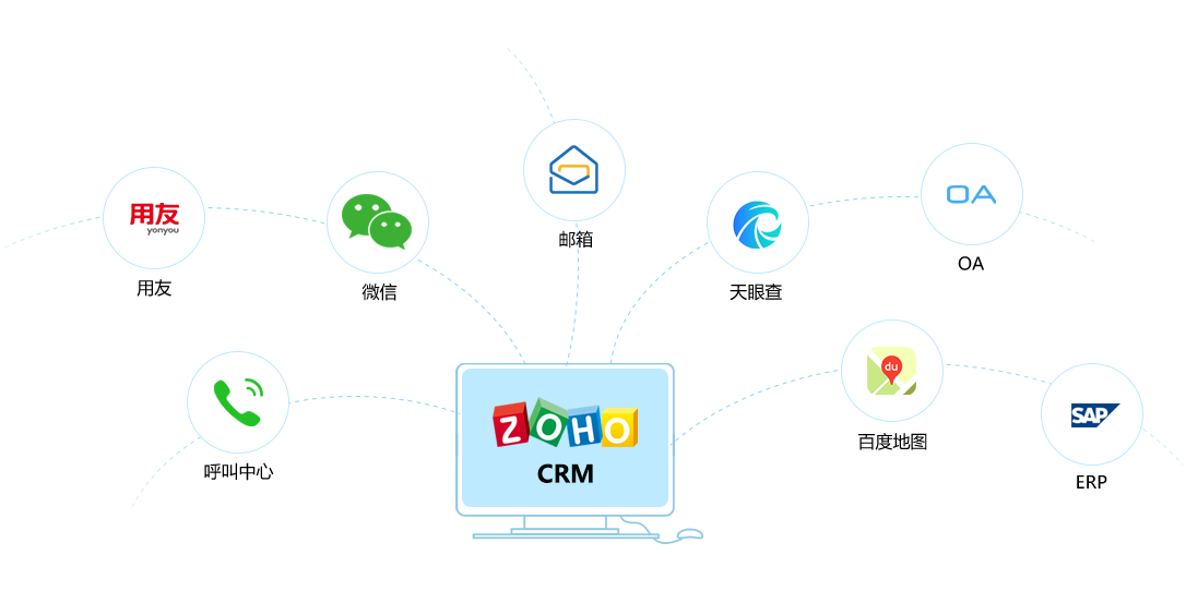 通过PaaS平台搭建企业CRM系统更多特有的功能,降低二次开发成本。天然集成Zoho体系内多款其他应用,数据互通,降低选型难度。提供标准API接口,方便对接国内其他OA、市场营销、ERP等软件,消除信息孤岛。