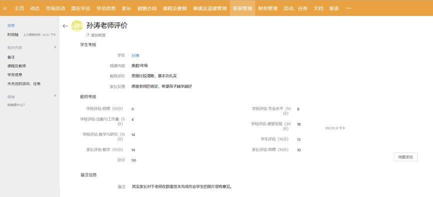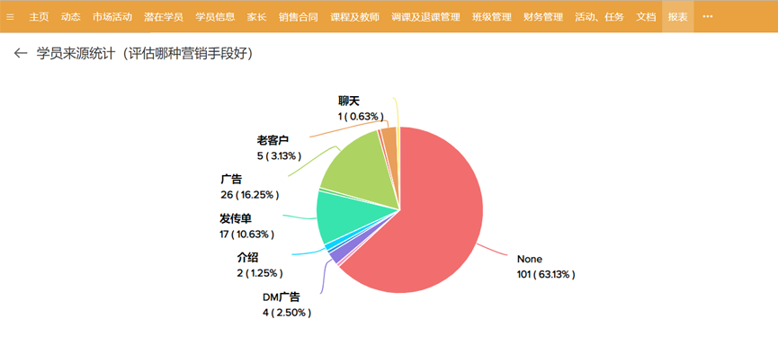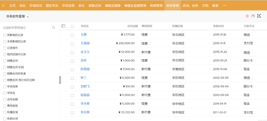完整统一的潜在学员库,可手动分配、业务员自己领取,或让系统按设置的条件自动分配 自动提醒业务员哪些学员需要联系 可通过报表分析每名业务员的潜在学员-正式学员转化率 -